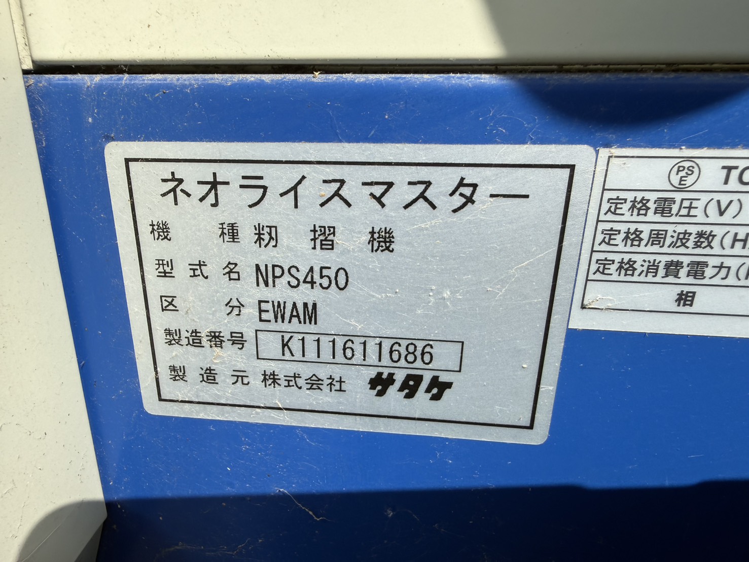 メーカー・品番 サタケ 籾摺機 NPS450